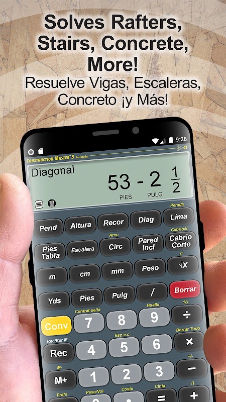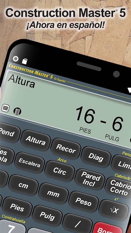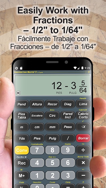 ¡Ahora completamente en español para su ekwipunek! Todas las teclas, pantallas y ayuda en español. Ahorre tiempo y reduzca errores costosos con la premiada calculadora de construcción Construction Master 5 especializada en pies-pulgadas-fracciones.