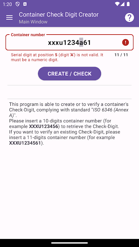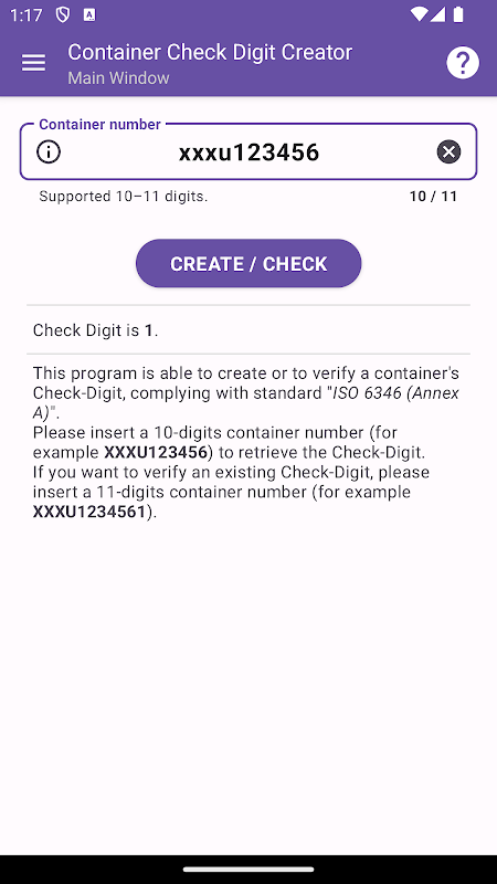 Ta aplikacja może utworzyć lub zweryfikować cyfrę kontrolną kontenera, zgodną z normą ISO 6346 (załącznik A).