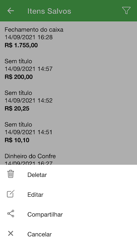 Você pode ordenar os itens salvos por data e por valor, facilitando ainda mais o seu controle de caixa.