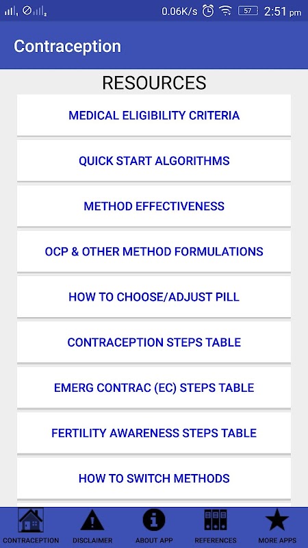 Jak widać na zrzucie ekranu ekranie głównym zasoby w tej aplikacji są: medyczne kryteria kwalifikujące (przeciwwskazania) tabela referencyjna, Skrócona Algorytmy, stół z Method skuteczności, stół wszystkich OCP preparatów na rynku i innych niż pigułki hormonalne preparaty, wytyczne dotyczące Jak wybrać i rektyfikacja OCP dawek, kroki kryteria (bezpieczeństwo, tolerancję, skuteczność cena, prostota schematu) dla wszystkich metod antykoncepcji, skoncentrowany krokach tabelę porównawczą metod świadomości płodności, koncentruje krokach tabelę porównawczą metod antykoncepcji, wytyczne co do sposobu przełączyć metod i tabelę sprawdzianach i niezbędne warunki wstępne badania (przed podaniem), antykoncepcji.