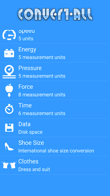 Converall to przyjemny i łatwy w użyciu konwerter jednostek z 30 różnymi modułami, a naszym celem jest to, że znajdziesz WSZYSTKIE, które musisz przekonwertować lub obliczyć w jednej aplikacji, ConvertALL.