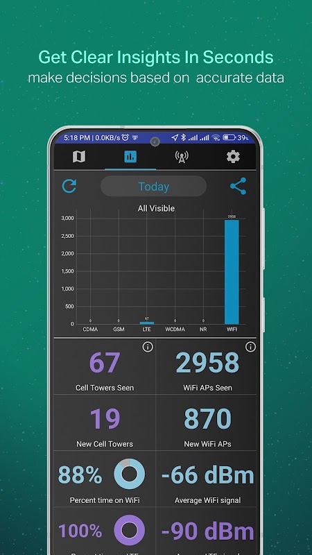 - Używa dokładnych odczytów mocy sygnału WiFi i komórka z telefonu