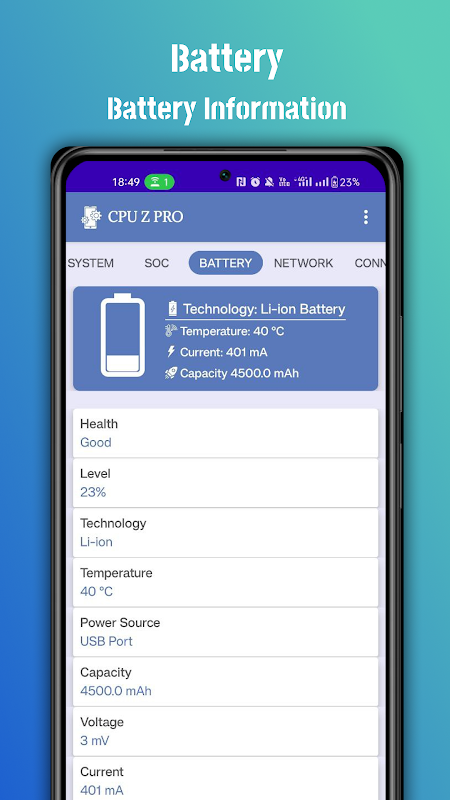 ➡️ Informacje o baterii: monitoruj stan baterii urządzenia, poziom, stan, źródło zasilania i szczegółowe informacje techniczne, takie jak temperatura, napięcie, zużycie energii i pojemność. Śledź wydajność swojej baterii.