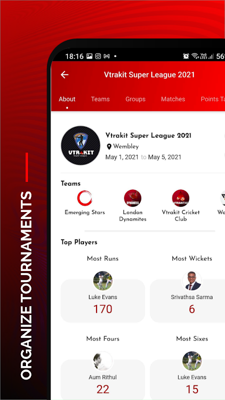 Organizuj i planuj wszystkie swoje TURNIEJE i ligi krykieta w aplikacji. Planuj i graj mecze, śledź tabelę punktów, pobieraj statystyki turniejów w MS Excel i przyznawaj nagrody indywidualnym graczom