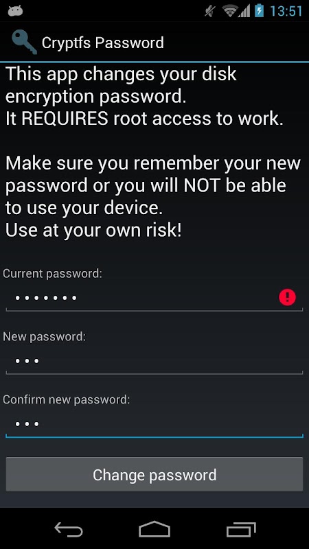 Android 3.0 (Honeycomb) wprowadzono szyfrowanie dysku i jest on dostępny na wszystkich kolejnych wersjach. Szyfruje partycję danych z kluczem chroniony hasłem wybranym przez użytkownika i wymaga wprowadzenia hasła w celu uruchomienia urządzenia. Jednak Android używa hasła odblokowania urządzenia lub PIN jako hasło szyfrowania urządzenia, i nie pozwalają na zmianę ich osobno. To skutecznie zmusza do stosowania prostego hasła, ponieważ trzeba wprowadzać go przy każdym odblokować urządzenie, zazwyczaj kilkadziesiąt razy dziennie. To narzędzie pozwala na zmianę hasła szyfrowania do bardziej bezpiecznego jednego, bez wpływu na odblokowania ekranu hasło / kod PIN. Aby zmienić hasło szyfrowania Urządzenie po prostu: