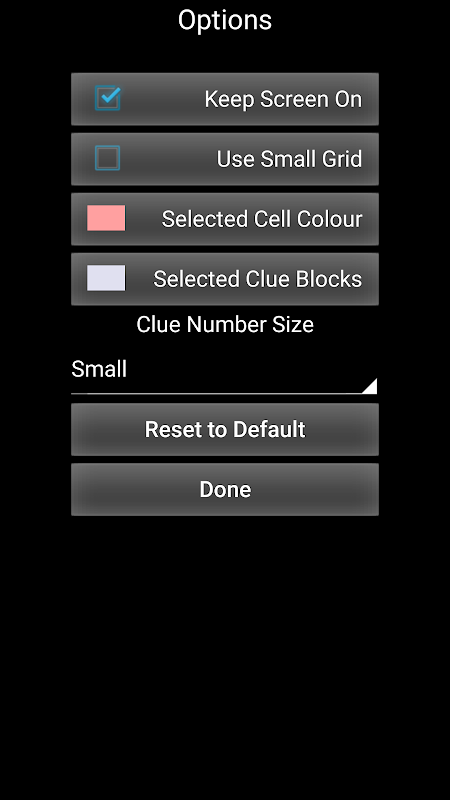 - Change size of clue numbers - on some devices the clue numbers (in the blocks) can be very small. You can optionally set the size of the number to either small (the default), medium or large.
