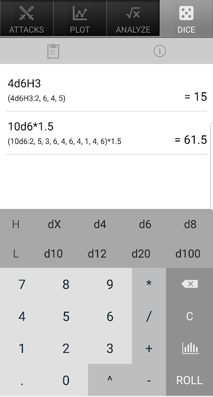 Ver. 1.9: Ulepszony wałek do gry w kości: moc obliczeniowa, multiplikacja, podział i rolka górna / dolna. Np .: 4d6H3 - rzuć 4d6 i trzymaj 3 najwyższe kości. 2d20L - rzuć 2d20 i zachowaj niższe kości.
