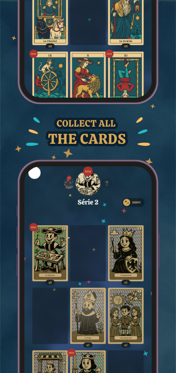 Sercem Daily Arcana jest zbieranie wspaniałych kart tarota Wielkich Arkanów. Każdego dnia otwórz swój bezpłatny pakiet boosterów i poczuj dreszczyk emocji odkrywania nowej karty. Twój cel? Zebrać je wszystkie i odkryć ich sekrety.