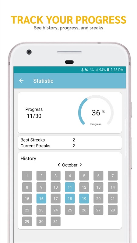 4. Umożliwiamy Ci przeglądanie i obserwowanie twoich postępów, aby zmotywować Cię do działania. Przesuwaj dalej, aby stworzyć dobry nawyk.