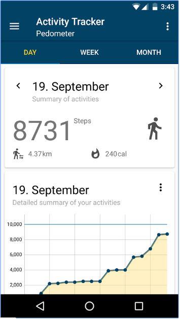 Codziennie Kroki krokomierz może liczyć swoje kroki w tle, zapewnia przegląd o swoje kroki i wszedł pozwala zdefiniować tryby zwyczaj chodzenia i powiadomienia, jeśli osiągnięcie dziennego etapu cel jest w niebezpieczeństwie. Aplikacja wymaga minimalnych uprawnień (Uruchom przy starcie i zapobiec telefonu w tryb uśpienia).