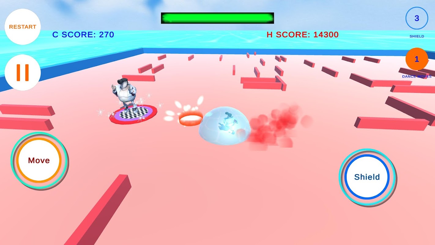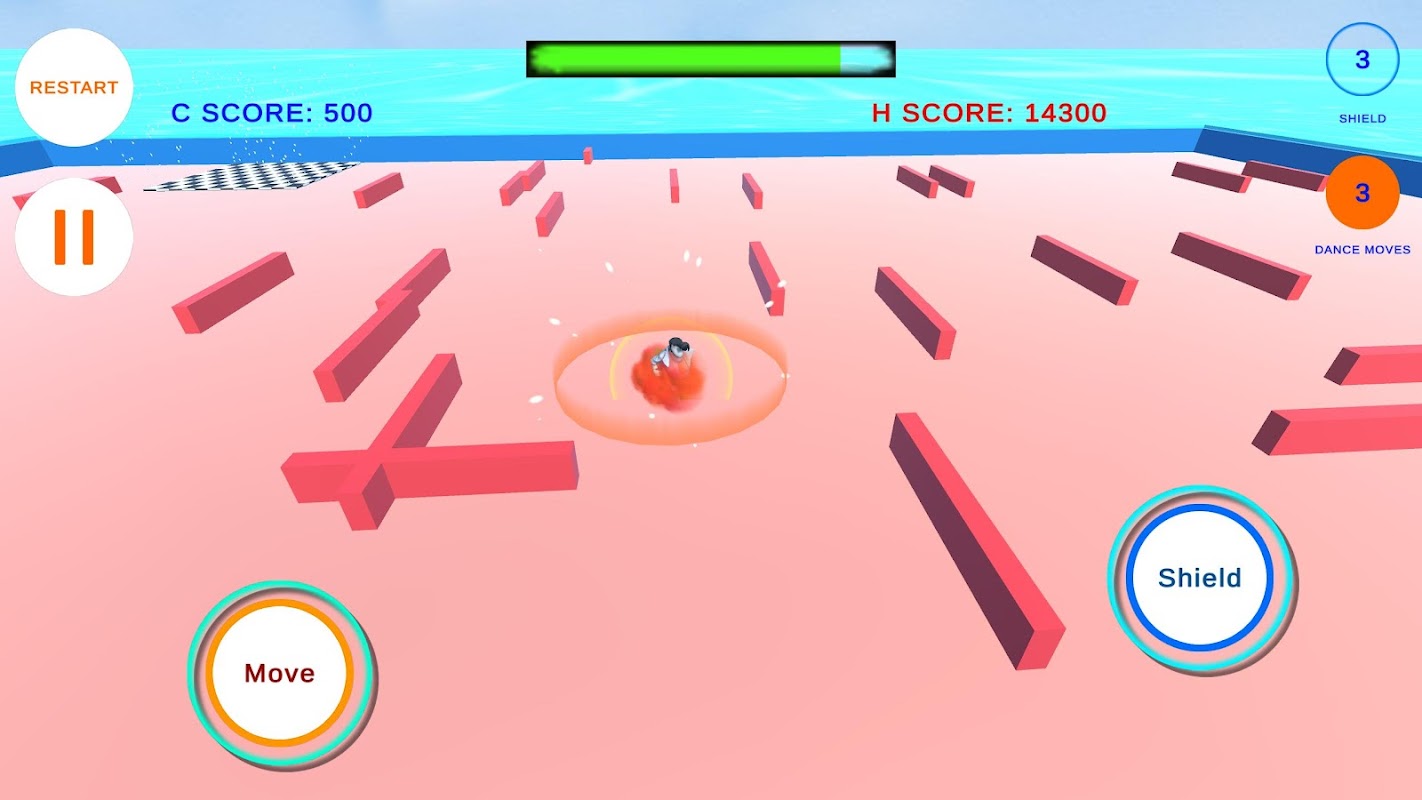 DanceFloor Race is a Maze game whereby the player has to avoid being hit by sliding bars while trying to collect dance moves from dancing figures on the floor. The player's only protection from the sliding bars are shields which the player can collect by running into randomly placed blue balls or by using the 3 default shields he/she has through the shield button. When activated the shield enables the player to accumulate points whenever a bar is destroyed by the shield. The player also accumulates points when he/she collects dance moves from the dancing figures. The points are then credited to the player when he/she enters the checked dance floor, where the number of dance moves collected is multiplied by the number of points accumulated.