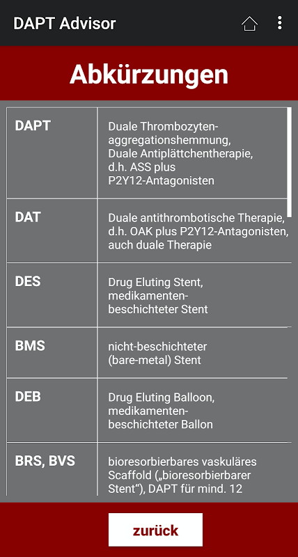 Die App DAPT Advisor bietet ein klares und eindeutiges Antikoagulationsregime (Welche Medikamente? Wie kombinieren? Wie lange?) für jeden einzelnen Patienten abhängig vom erfolgten kardialen Eingriff, z.B. nach Stentimplantation, TAVI oder nach Myokardinfarkt. Die Grundlage der Empfehlungen sind die aktuellen Leitlinien der deutschen und europäischen Gesellschaft für Kardiologie (DGK und ESC).