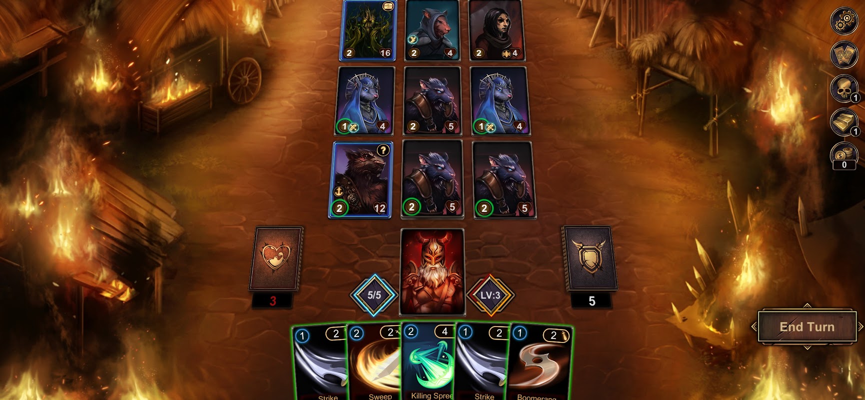 ● Twoje zdrowie jest równe liczbie kart w Twojej talii. Za każdym razem, gdy otrzymujesz 1 obrażenie, wróg otrzymuje 1 kartę. Jeśli twoja talia jest wyczerpana, gra się kończy.