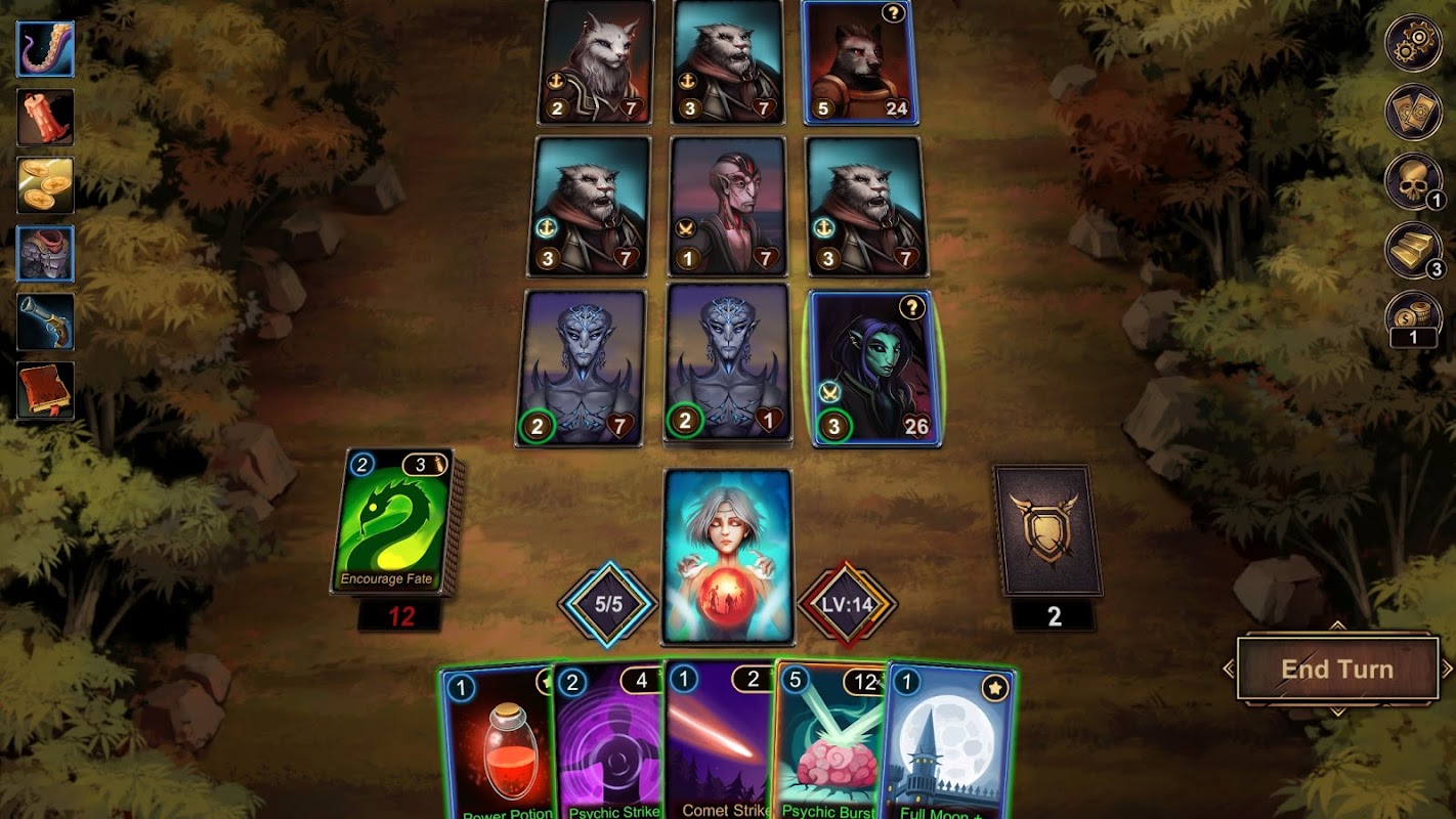 ● W grze występują trzy rodzaje kart: ataki, umiejętności i klątwy. Bycie defensywnym nie jest opcją przeciwko złu mgły. Atakuj szybko i desperacko, aby przeżyć.