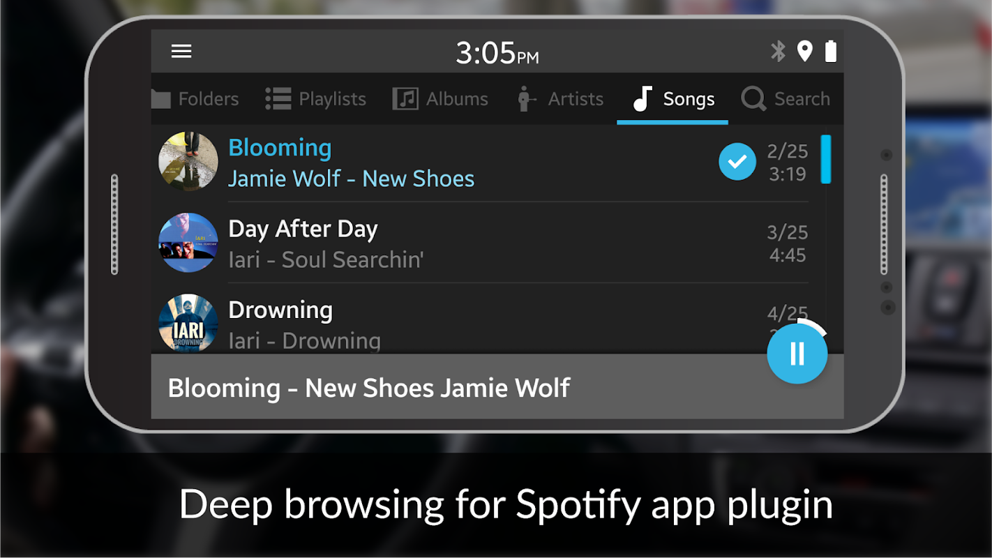 Local Music: (stored on the smartphone) browse by Folders, Playlists, Artists, Albums, Songs.
