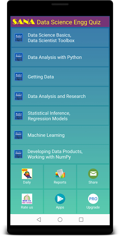 Aplikacje Data Science Quiz to innowacyjna koncepcja Sana Edutech, która zapewnia materiały szkoleniowe na temat aplikacji na Androida w szybkim i przyjemnym interfejsie użytkownika.