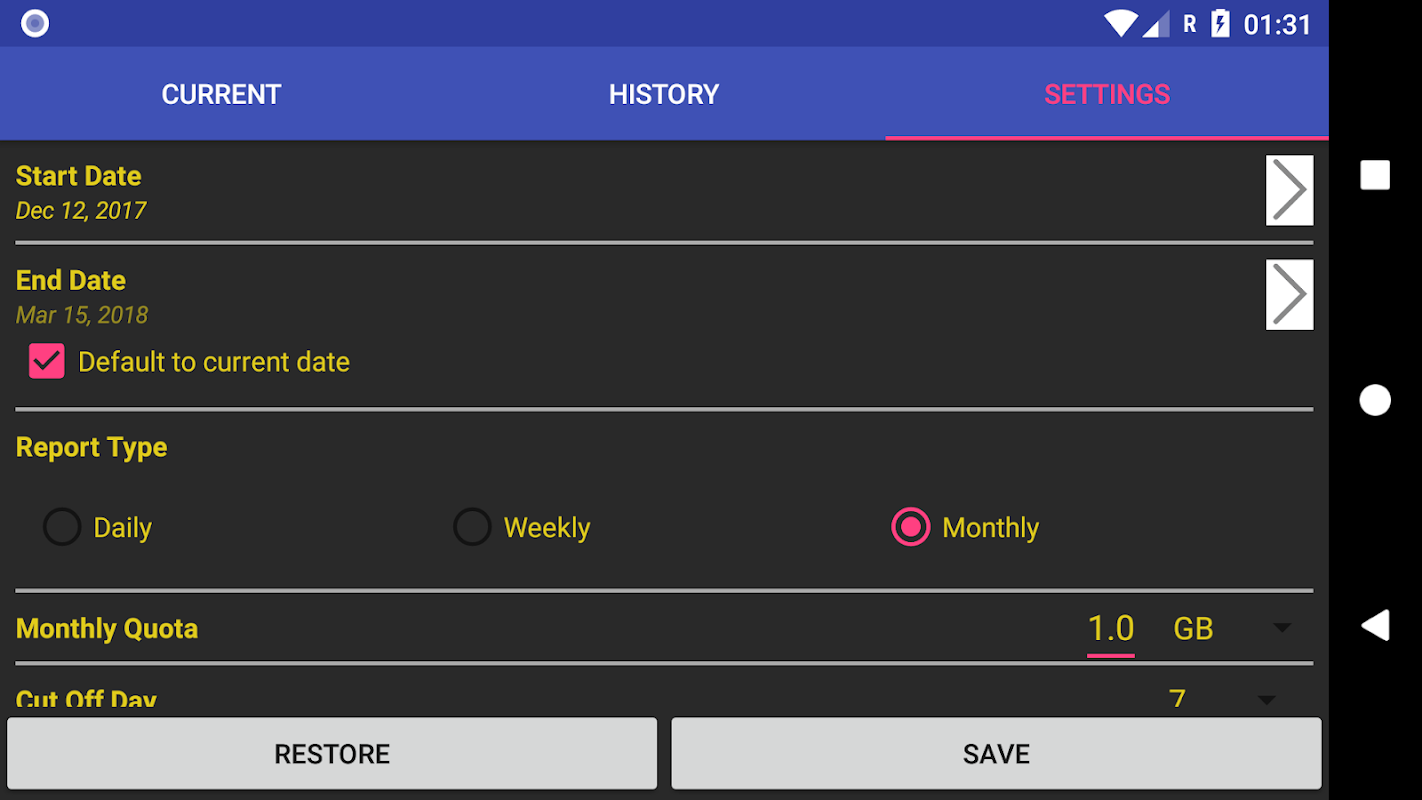 On second page, you can review usage history on daily, weekly or monthly basis.