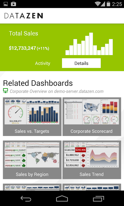 Access enterprise data through your mobile device quickly, effectively and securely. Datazen for Android allows you to connect a Datazen Server and access KPIs and Business Intelligence dashboards based on Excel, SQL Server, SharePoint and other data sources.