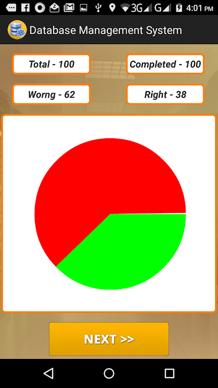 Pod koniec sesji, wyświetla wyniki z wykresu kołowego. Można podzielić ten wynik z przyjaciółmi. Jeśli chcesz dowiedzieć się więcej na ten temat, aplikacja posiada także tutoriale za darmo. Jest to kompleksowe narzędzie, które przygotowuje do egzaminu DBMS.