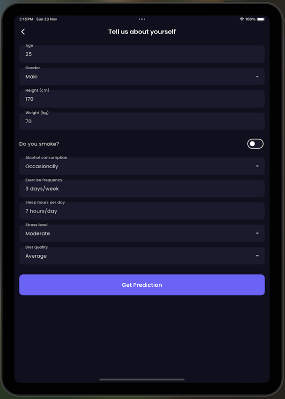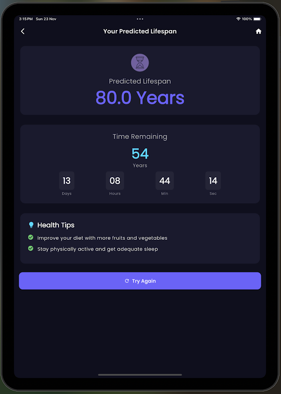 Ta aplikacja została zaprojektowana w celach rozrywkowych i edukacyjnych, oferując zabawne, a zarazem wnikliwe prognozy oparte na Twoich codziennych nawykach — takich jak sen, stres, ćwiczenia, jakość diety, palenie tytoniu, spożycie alkoholu i wiele innych.