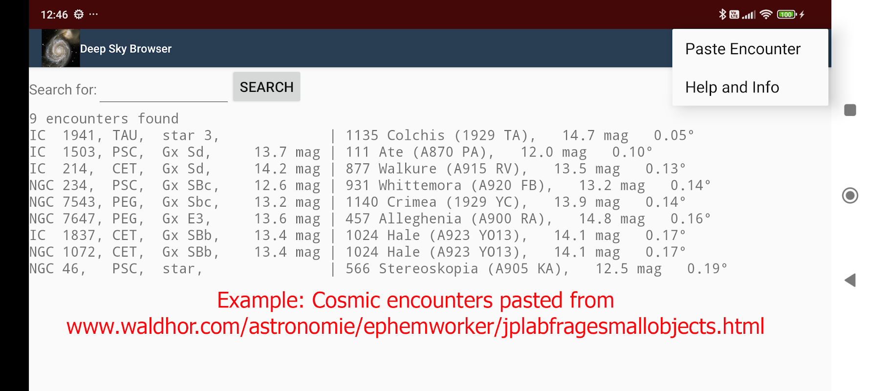 Program wyświetla informacje o obiekcie z bazy danych NGC-IC.