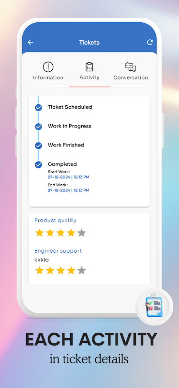 • Śledź status biletu: sprawdź status biletu, taki jak zaplanowany, w toku i bilet ukończony, który użytkownik może sprawdzić bezpośrednio z urządzenia.