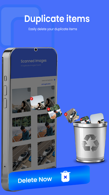 Aplikacja do usuwania zduplikowanych zdjęć przeskanuje wszystkie zduplikowane zdjęcia w telefonie komórkowym i pozwoli wybrać i usunąć zduplikowane zdjęcia. Narzędzie do usuwania duplikatów zdjęć jest łatwe w użyciu. Wszystko, co musisz zrobić, to wybrać typ skanowania i rozpocząć skanowanie, aby znaleźć dokładne lub podobne dopasowania do zdjęć. Narzędzie do usuwania zduplikowanych zdjęć przeszuka pamięć urządzenia. Krótko mówiąc, jest to prosta aplikacja, która pomaga usuwać zduplikowane zdjęcia i filmy, oszczędzać czas i odzyskiwać miejsce na urządzeniu z Androidem. Czy potrzebujesz aplikacji do czyszczenia przestrzeni, która może wykryć wszystkie zduplikowane zdjęcia i filmy i natychmiast je usunąć? Czy chcesz usunąć wszystkie zduplikowane zdjęcia i filmy za pomocą nowego, wydajnego i inteligentnego narzędzia do czyszczenia pamięci masowej.