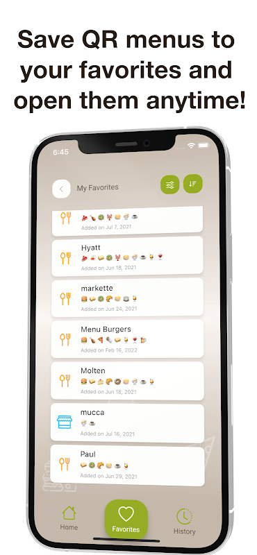 ❤️ Zapisz menu QR swoich ulubionych lub często odwiedzanych miejsc na smartfonie, aby uzyskać późniejszy dostęp z dowolnego miejsca! Dzięki naszej aplikacji. w dowolnym momencie możesz bezpośrednio otwierać menu zapisane w ulubionych, bez konieczności ponownego skanowania kodu QR.