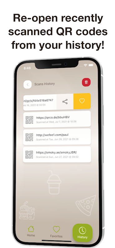 Otwórz ponownie ostatnio zeskanowane kody QR jednym dotknięciem! Nasza aplikacja. zapamiętuje zeskanowane kody QR i przechowuje je w historii skanowania smartfona.