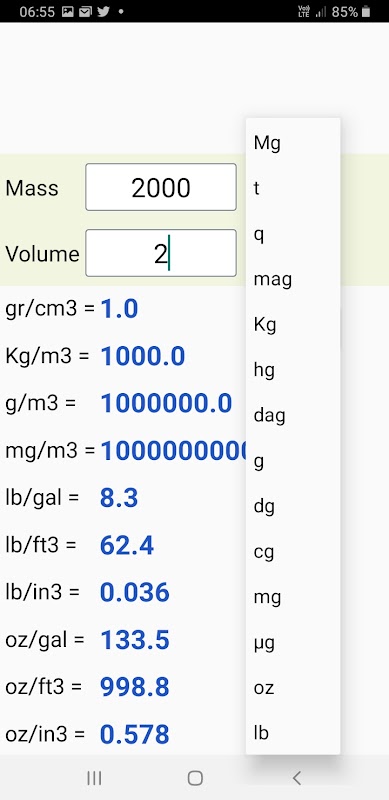 g/cm3, kg/m3, g/m3, mg/m3, funt/gal, funt/stopa3, funt/cal3, oz/gal, oz/stopa3, oz/cal3