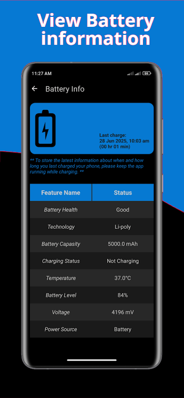 Sprawdź stan baterii, aktualną temperaturę, stan ładowania, napięcie, technologię i czas ostatniego ładowania.