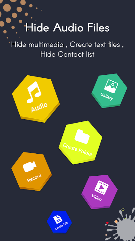- Hide any type of file such as apk, audio, video, image, video, pdf and etc files