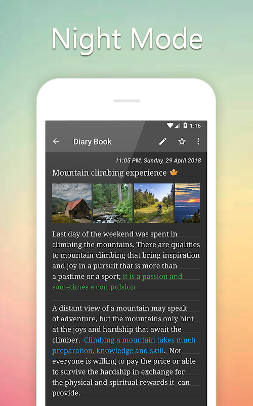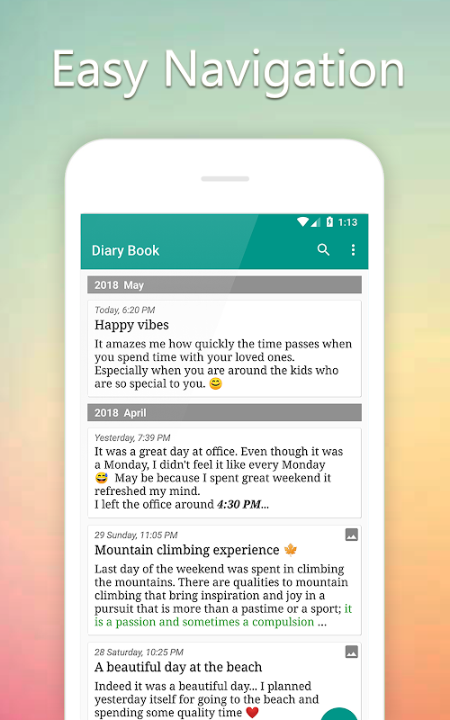 Diary Book - With Lock to chroniona hasłem, prosta, ale funkcjonalna, bezpłatna aplikacja dziennika. Dzięki wielu motywom, bogatym opcjom tekstowym i różnym stylom czcionek spersonalizuj swój dziennik własnym gustem. Zabezpiecz swoje wspomnienia w dzienniku dzięki Dyskowi Google i opcjom lokalnej kopii zapasowej.