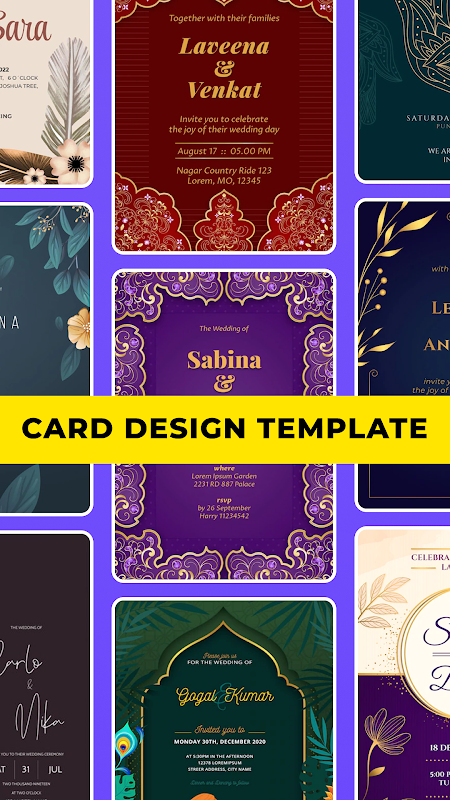 Bezpłatna aplikacja do tworzenia kart zaproszeń zapewnia tysiące szablonów do tworzenia własnych niestandardowych kart zaproszeń. Możesz użyć aplikacji do projektowania kart ślubnych, aby wysłać zaproszenie, aby zaprosić swoich bliskich na Wesele, Zaręczyny, Spotkanie, BBQ również do prac profesjonalnych, takich jak spotkania, imprezy zawodowe, przyjęcie z okazji ukończenia szkoły i wiele innych. Możesz łatwo dostosować projekty i edytować je za pomocą własnych obrazów, wiadomości, naklejek itp.