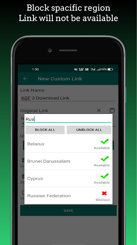 Jak nazwa, linki niestandardowe są użyteczne. Możesz podać dowolny link (adres URL), a aplikacja to narzędzie zwróci Ci inny link. Ten link po prostu przekierowuje oryginalny link, ale spełnia warunki. Możesz ustawić dostępność w danym kraju i limit wykorzystania według numeru.