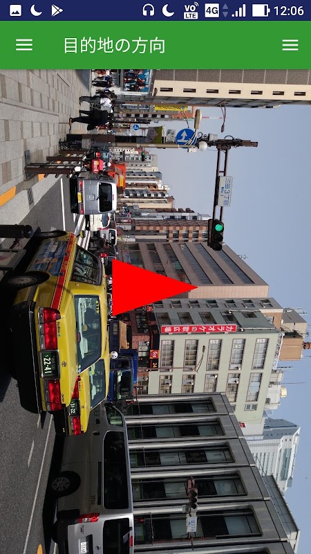 2.目的地の方向を調べる画面を開き、スマートフォンの画面に映る矢印で目的地の方向を確認します。この時、スマートフォンは横向きにしないと矢印が表示されません。