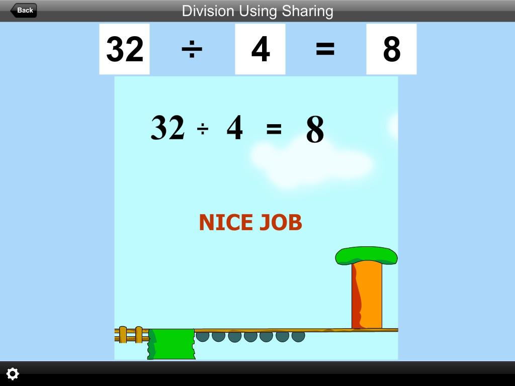 In this app, a division problem (for instance, 18 ÷ 2 = ) is illustrated by sharing a certain number of apples (18) between a certain number of girls (2). When the student clicks on the first number (18) that many apples (18) appear on the screen. When the student clicks on the second number (2) that many girls (2) with baskets appear. The student then clicks on each apple, which then moves into a girl’s basket. Each apple gets a number when it gets into a basket. The student will be told to click on the last apple in the last basket, which will be blinking (that apple’s number is the answer). That number (9) will rise into the number statement.