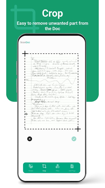 Scan Doc umożliwia obracanie i przycinanie dokumentów zgodnie z własnymi preferencjami. Możesz przyciąć niechciany tekst lub grafikę z zeskanowanych lub zapisanych dokumentów.