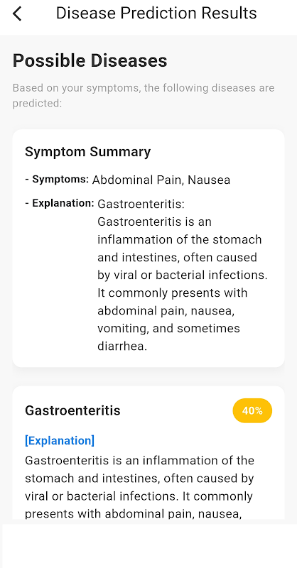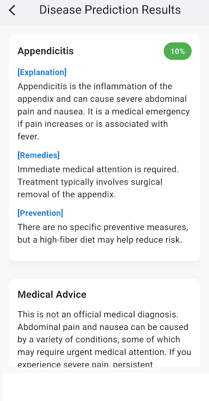 Wyjaśnienie choroby: Aplikacja zapewnia szczegółowe opisy przewidywanych chorób, w tym przyczyny, objawy, czynniki ryzyka i możliwości leczenia.