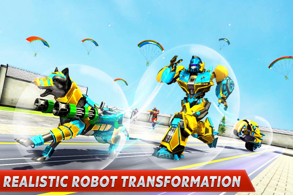Najnowszym dodatkiem do gry o transformacji robotów jest Dog Robot Transform Moto Robot Transformation Game - wielu robotycznych wrogów próbuje siać terror w mieście w najnowszej grze o robotach dla psów na arenie gier o transformacji robotów i gier o transformacji robotów za pomocą gier o robotach transformujących. Potężny pies-robot jest potrzebny, aby pomóc miastu znaleźć podejrzane działania w robotycznym mieście położonym w grach z robotami transformującymi. Przygotuj się na przekształcenie superbohatera w psiego robota? Weź udział w miejskiej bitwie, w której toczą się wojny robotów między wielkimi robotami i psim robotem, które mogą przekształcić się w futurystyczny motocykl. Realistyczna transformacja robota rowerowego zapewni prawdziwy dreszczyk emocji podczas grania w gry z robotami transformującymi, a także gry z robotami dla psów. Transform Robot Games czeka na wszystkich miłośników gier z robotami.