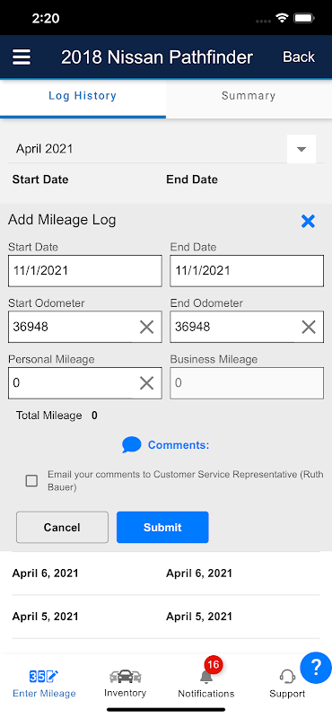 • B & P - Pozwala użytkownikowi na przeglądanie, edytowanie i usuwanie nowych i istniejących ewidencji przejazdów dla swoich pojazdów aktywnych i nieaktywnych