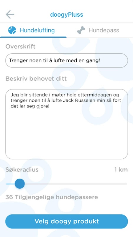 • Har du behov for hundelufting her og nå? Send en forespørsel til flere og få umiddelbar tilbakemelding.