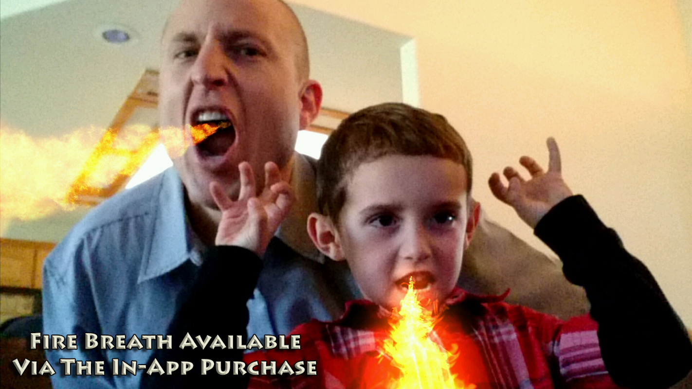 Transform yourself into a fire breathing dragon! See dragons roar and burn objects while lurking and flying around the screen. Transport yourself to another world and create memorable photos and videos with Dragons in them!