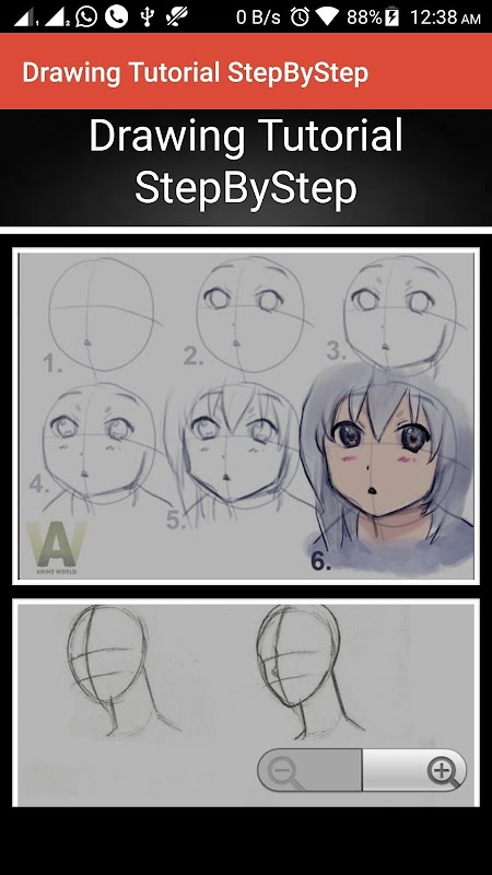 Drawing Tutorial StepByStep is an application which contains step by step tutorial of drawing picture with practices and lessons. Learners with this application will be guided to be able to have a pencil drawing and learn sketching with easy step by step drawings. Art lessons for beginners as in this application are full of gallery of pictures collected from many inspirations and high pencil techniques that the learners will be amazed. This sketching application shows how to draw a complete human body, animals, flowers, and manga cartoon. Pencil tutorial that will be explore in this application is about human body from the detail body to the whole such as tutorial to drawing head, drawing nose tutorial, drawing hair tutorial, drawing ear tutorial, drawing eyes tutorial, drawing shoulder tutorial, drawing hands tutorial, drawing waist tutorial, drawing legs tutorial, drawing foot tutorials, etc.
