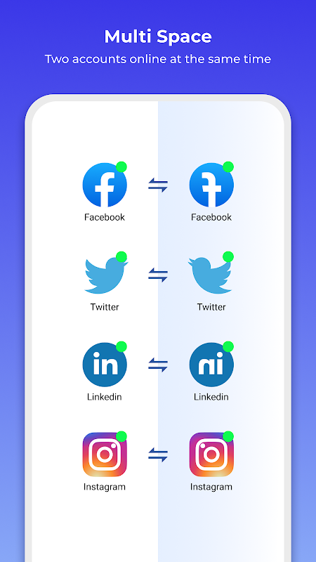 Multi Space is designed for users who log in more than 2 accounts (multiple accounts) of the same app on ONE PHONE, you can get dual WhatsApp and double Facebook easily.