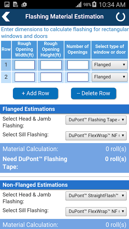DuPont™ Tyvek® Weatherization Calculator helps users determine material quantities of Tyvek® weather barrier wrap, and flashing system products. Estimate how many rolls of material to purchase after entrering dimensions of building size and penetrations. Evaulate more accurately with the ability to choose construction use and style. Next, share calculations easily by saving and sending PDF files.