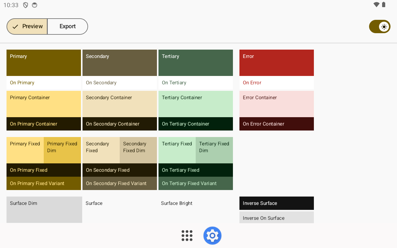 Eksport motywu dynamicznego to narzędzie umożliwiające podgląd i eksport dostępnych kolorów z bieżącego motywu dynamicznego urządzenia. Użyj tych kolorów jako punktu wyjścia do stworzenia nowego motywu dla swojej aplikacji.