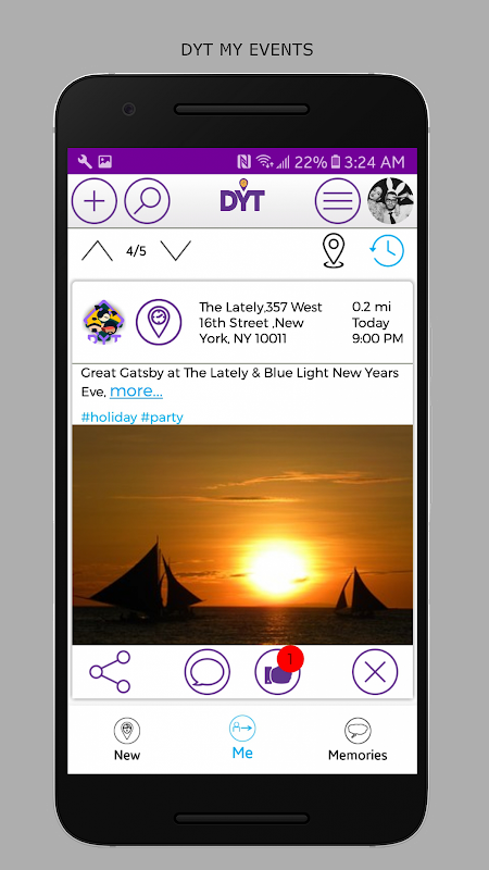 DoYourThing (DYT) pozwala organizować, dołączyć, i porozmawiać z innymi uczestnikami zdarzeń. Priorytet wydarzenia z kliknięciem tag inteligentny, aby wyświetlić zdarzenia pasujących zainteresowanie. Dostosuj swoje wydarzenia ze zdjęciami, opis, położenie oraz data / czas. DoYourThing (DYT) pozwala na tworzenie wydarzeń publicznych lub prywatnych. Zaproś uczestników do zdarzenia poprzez social media, e-mail lub SMS. Prywatne zaproszenia zdarzeń mogą być wysyłane tylko przez e-mail lub SMS i są widoczne tylko dla użytkowników, którzy zostali zaproszeni przez organizatora. Uczestnicy wydarzenia otrzymywać powiadomienia w czasie rzeczywistym o swoich imprezach.