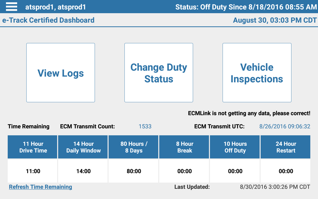 e-Track Certified jest interfejs użytkownika dla ELD dla tabletów i telefonów.