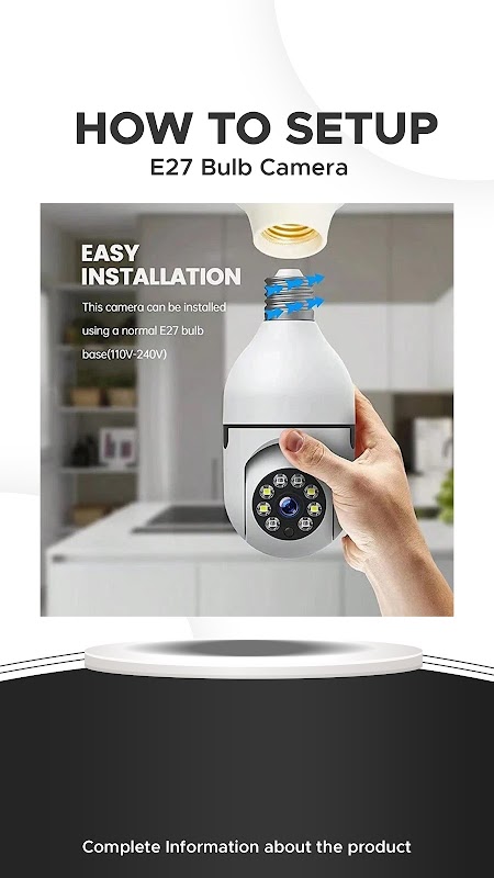 Tę zewnętrzną kamerę bezpieczeństwa z żarówką E27 można zainstalować przy użyciu zwykłej podstawy żarówki E27 (110 V ~ 240 V). Żarówkę kamery Wi-Fi Wireless 360 można zainstalować w dowolnym istniejącym gnieździe żarówki E27, nie ma potrzeby dodawania dodatkowego obwodu elektrycznego, zeskanuj kod QR kod i pobierz bezpłatną aplikację na swój telefon komórkowy w prostym kroku, oferujemy aplikację na Androida i IOS do wyboru.